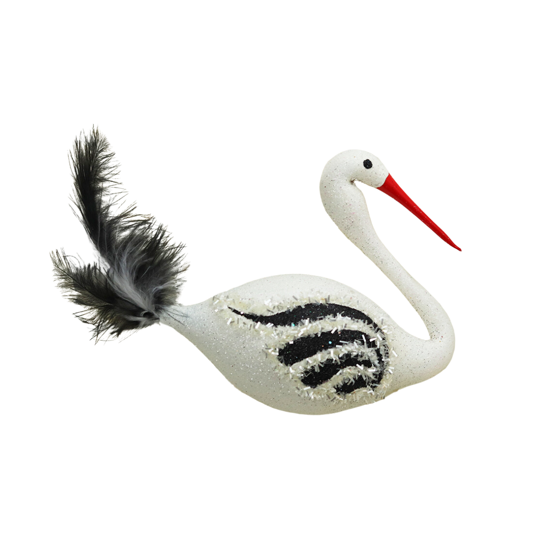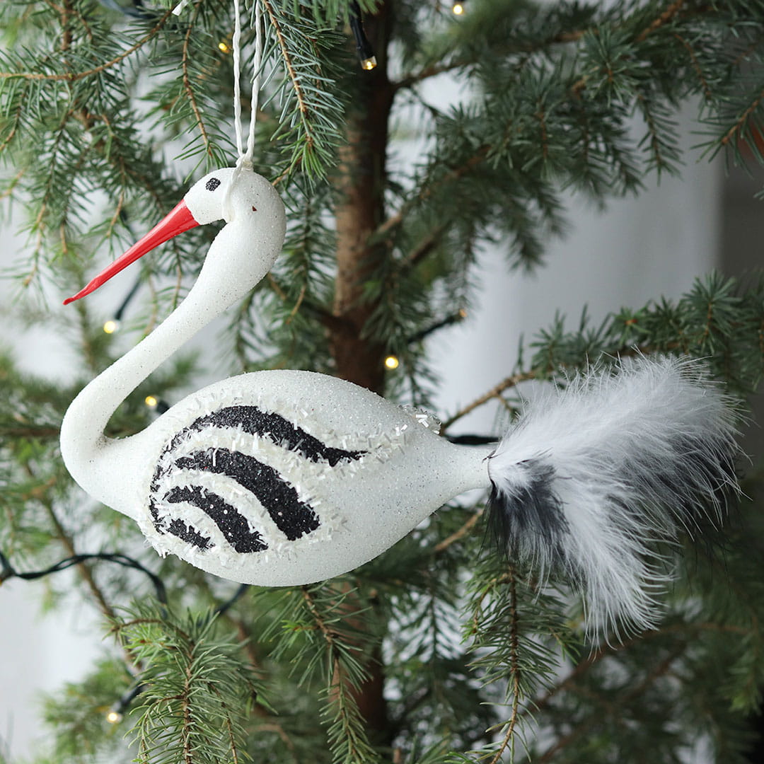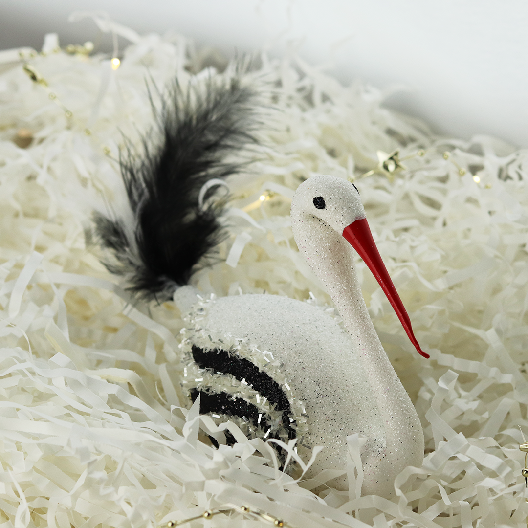 - Naturalne pióra: Ogon bociana został wykonany z prawdziwych piór, dodając bombce niezwykłego realizmu i wyjątkowego charakteru.