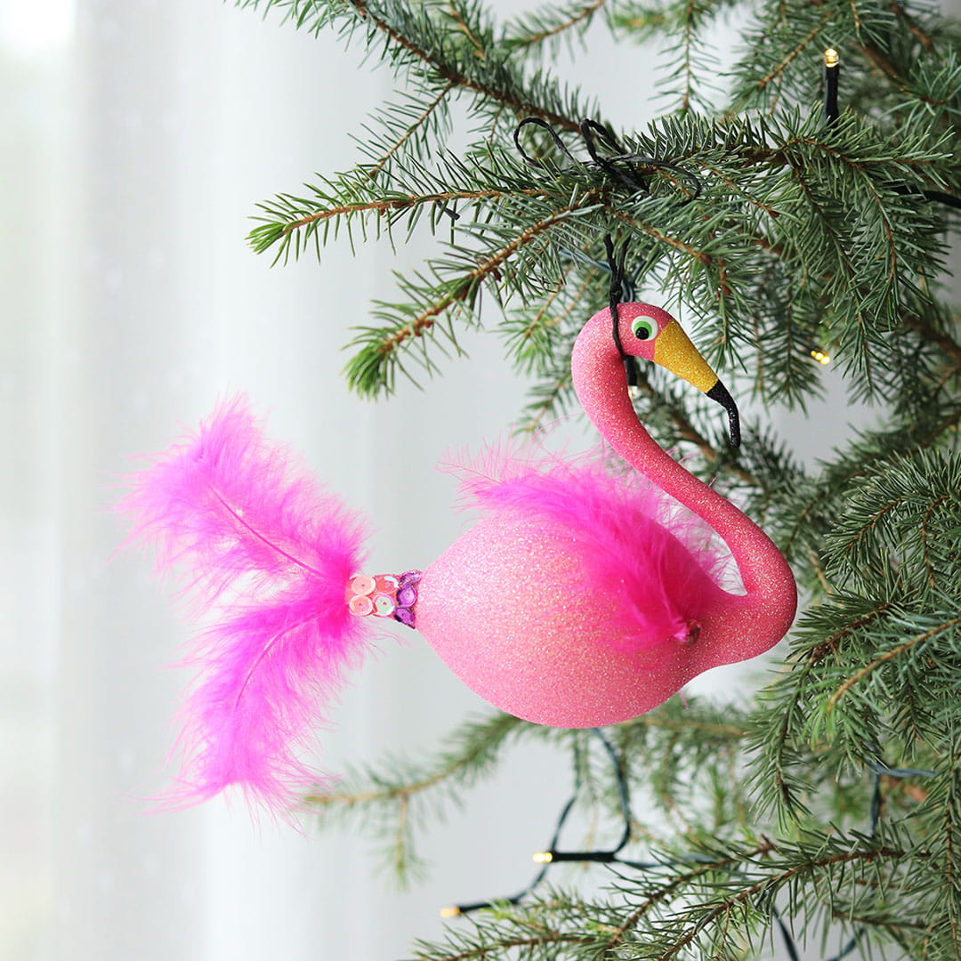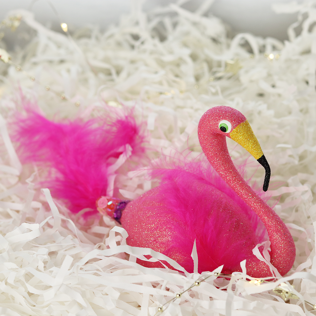 Prezentujemy elegancką i nietuzinkową bombkę choinkową, przedstawiającą różowego flaminga z efektownym ogonem z prawdziwych piór. Każda bombka jest ręcznie malowana w małej rodzinnej manufakturze, dzięki czemu każda z nich jest wyjątkowa i jedyna w swoim rodzaju. Subtelne, brokatowe wykończenie nadaje bombce świątecznego blasku i sprawia, że stanie się wyjątkową ozdobą Twojej choinki.
