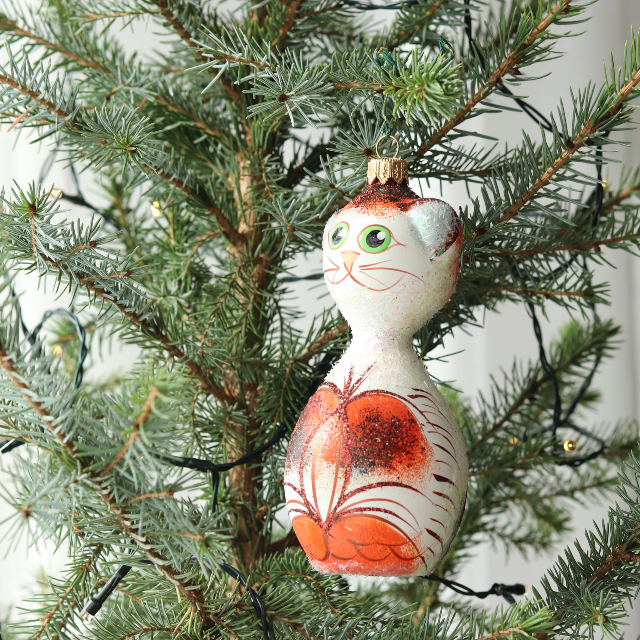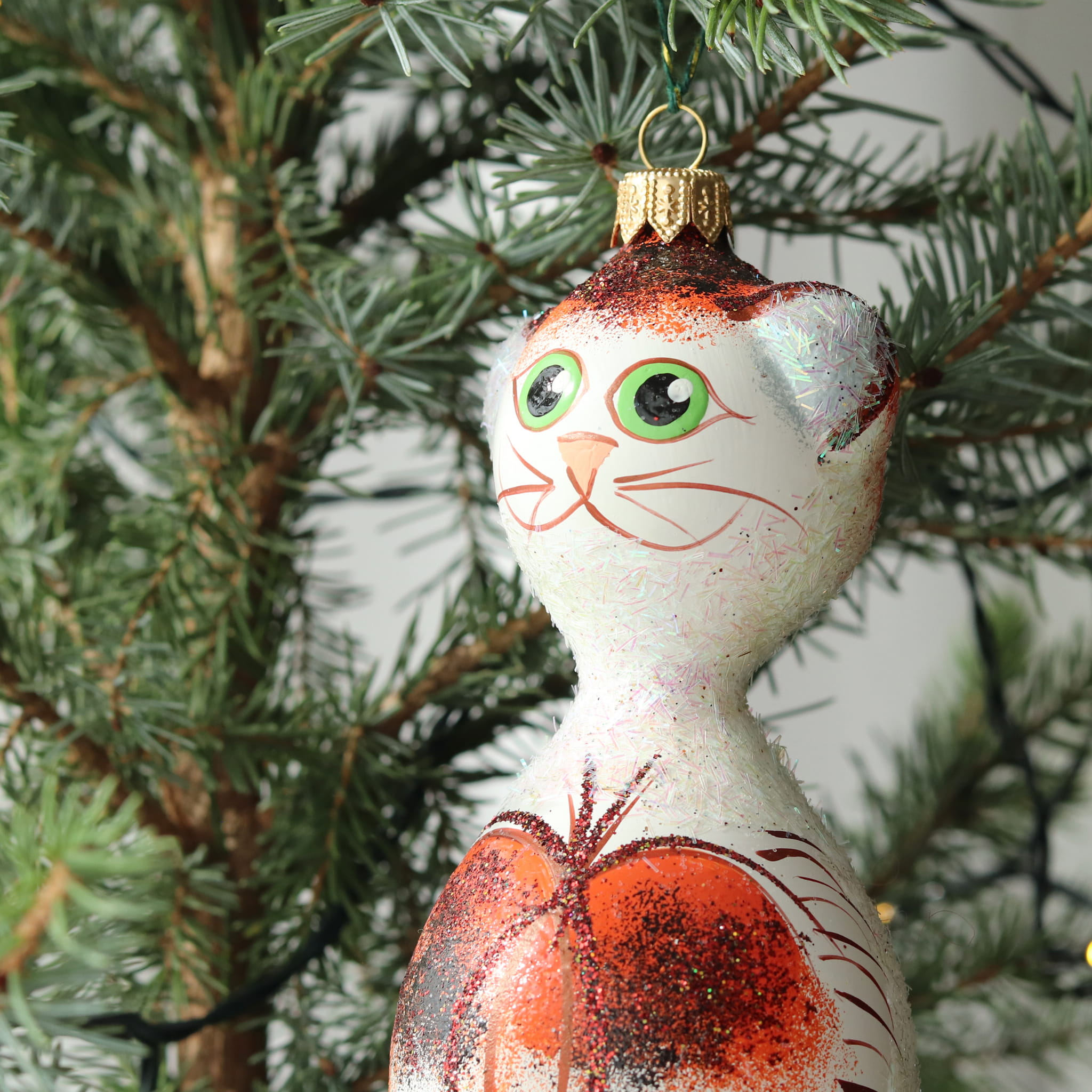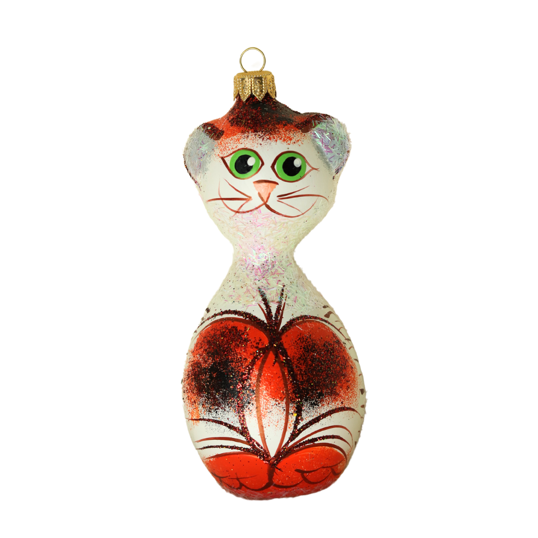 Urocza, ręcznie malowana bombka choinkowa w kształcie kota, w odcieniach bieli i pomarańczowego, ozdobiona subtelnym brokatem. Wykonana z niezwykłą starannością bombka w małej rodzinnej manufakturze zyskuje niepowtarzalny charakter, a każdy egzemplarz zachwyca unikalnością. Dzięki ciepłym kolorom i delikatnemu połyskowi, ta bombka doda Twojemu drzewku wyjątkowego uroku!