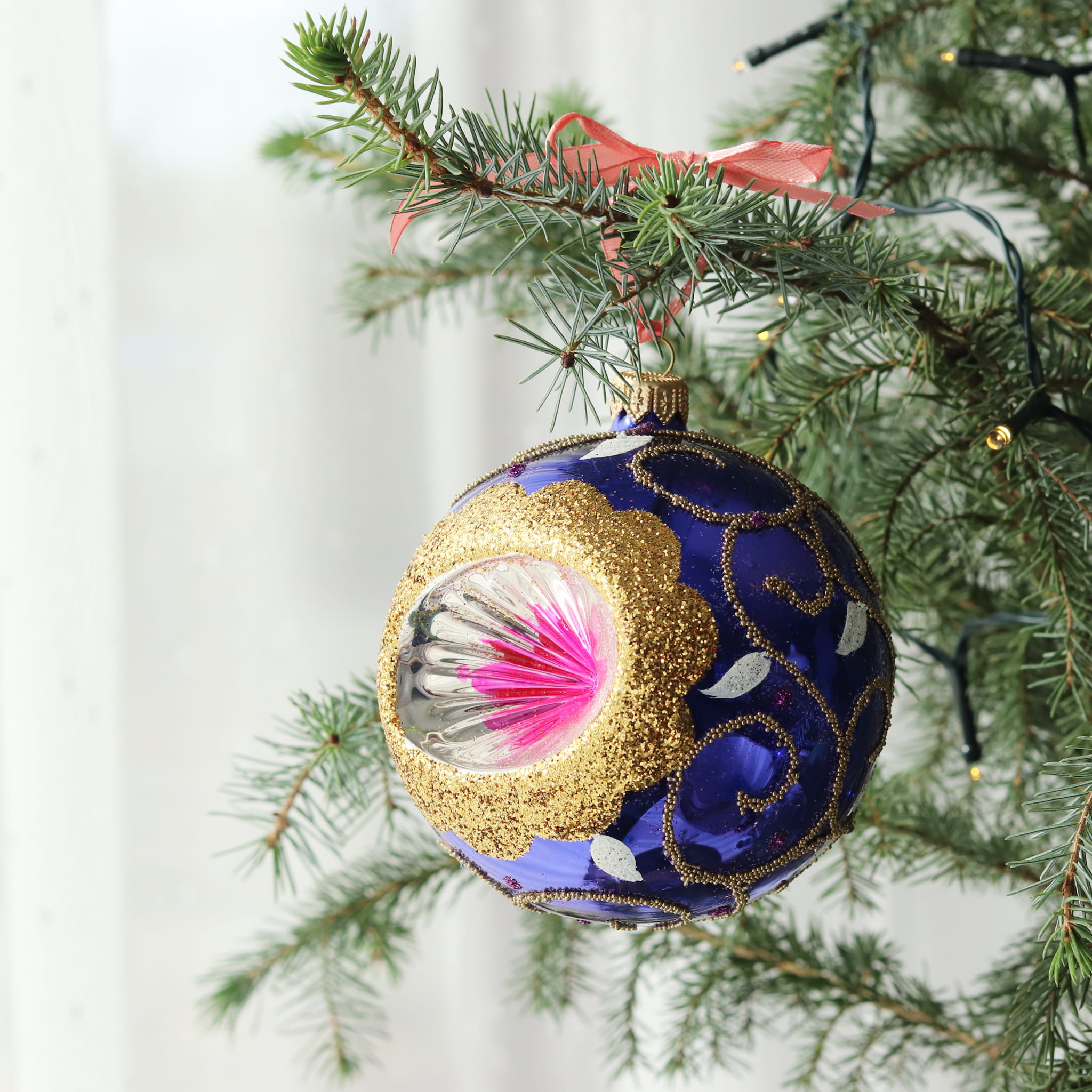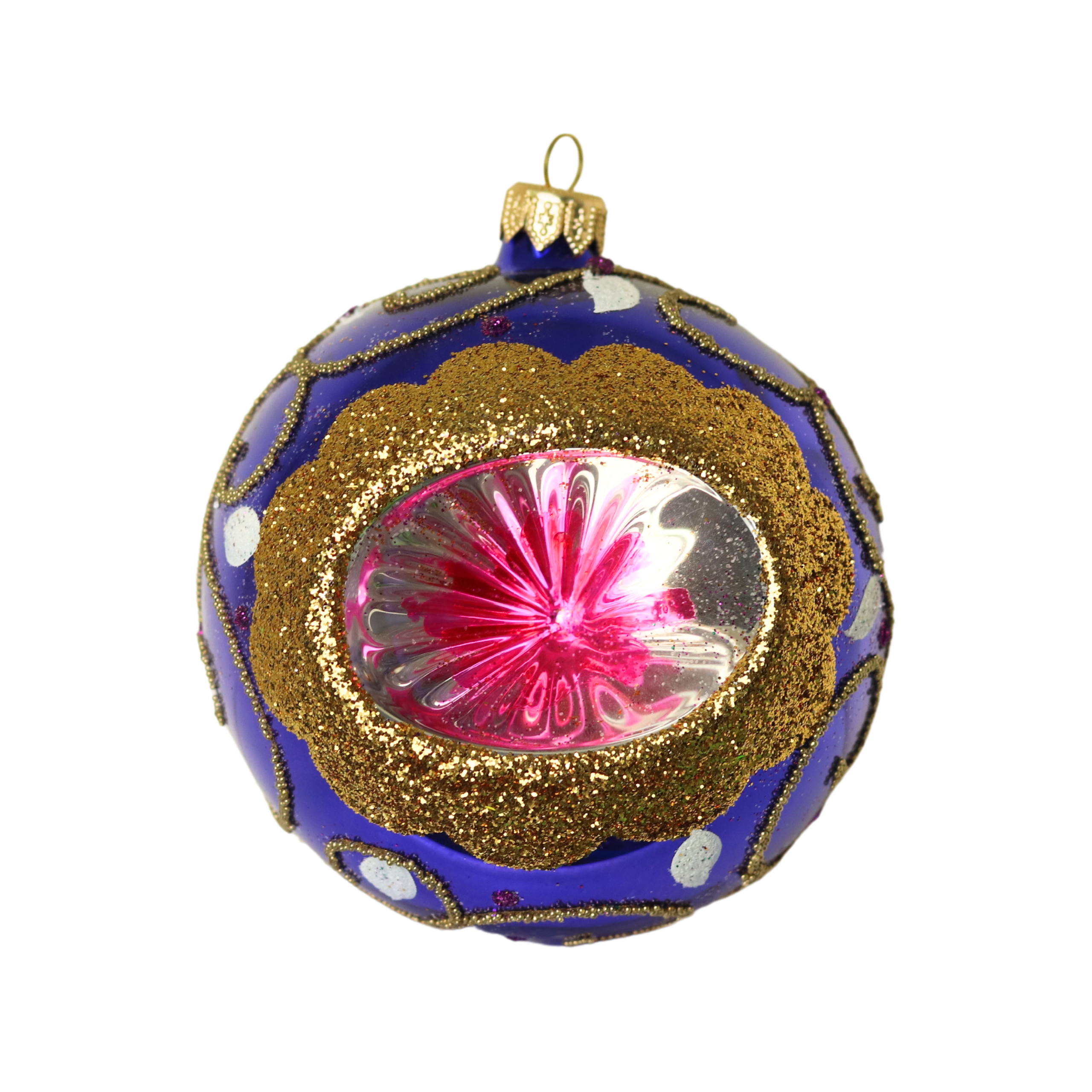 Wyjątkowa, ręcznie malowana bombka choinkowa typu reflektor – jej wklęsłe, misternie zdobione centrum tworzy przepiękny efekt, szczególnie kiedy odbija światło lampek choinkowych. Każda bombka jest ręcznie zdobiona w małej rodzinnej manufakturze, co sprawia, że jest unikalna i jedyna w swoim rodzaju. Złociste, brokatowe akcenty dodają elegancji i świątecznego blasku, czyniąc ją niezwykłą ozdobą na Twojej choince.