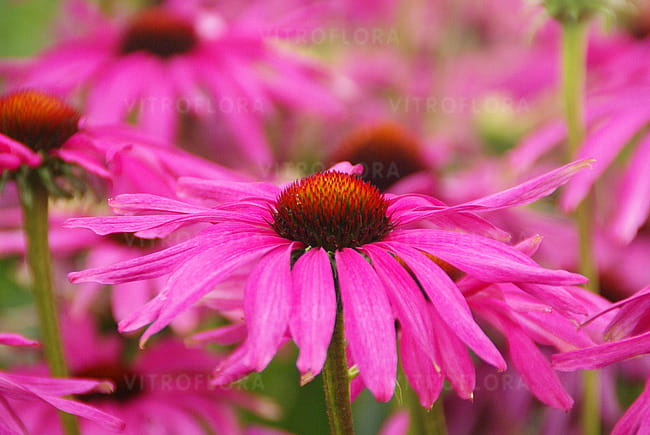 - Kwiaty: Duże, z wypukłym, ciemnobrązowym środkiem i długimi, wąskimi płatkami w intensywnie różowym kolorze. W miarę starzenia się płatki mogą jaśnieć, podczas gdy środek pozostaje ciemny.