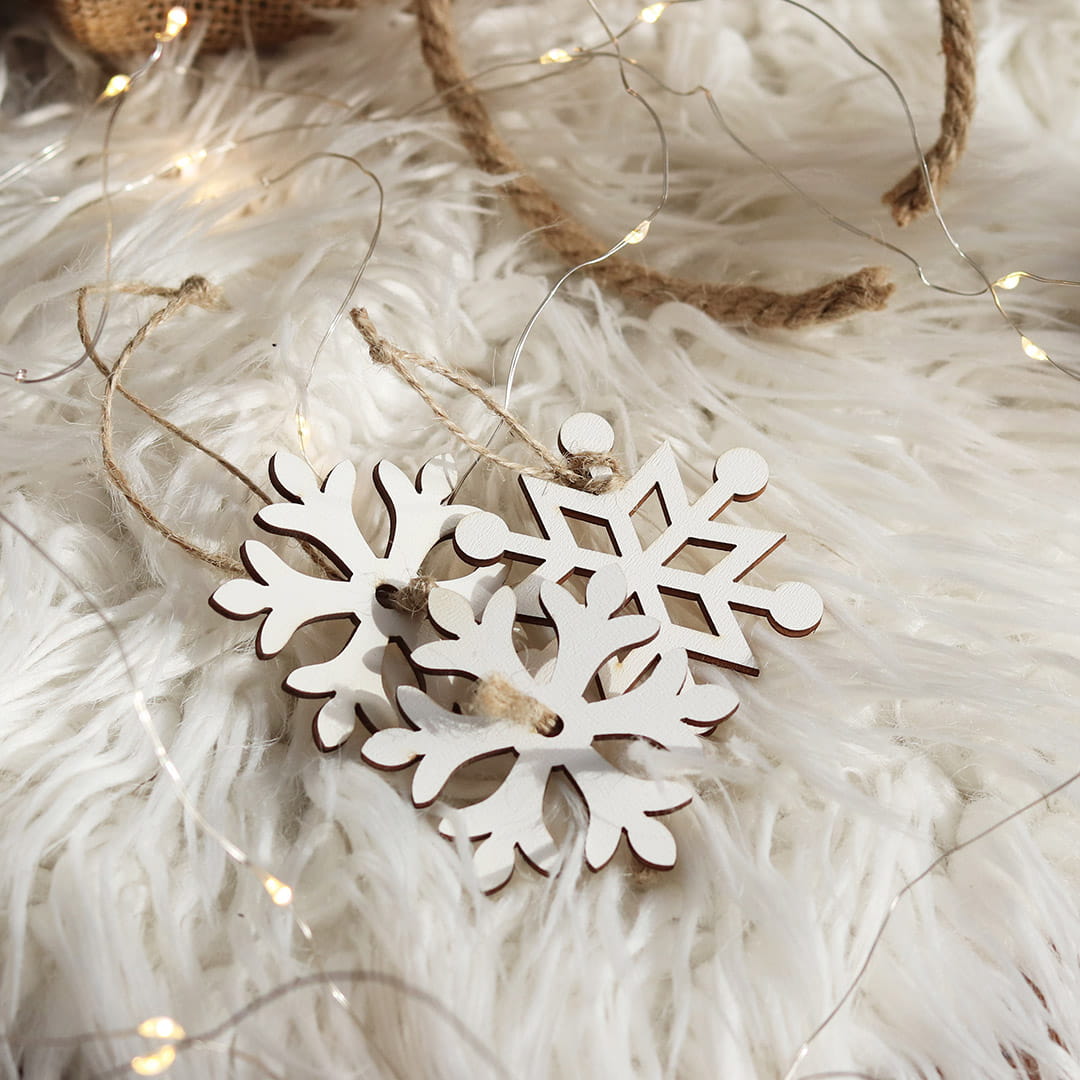 - 8 drewnianych zawieszek w kształcie płatków śniegu.