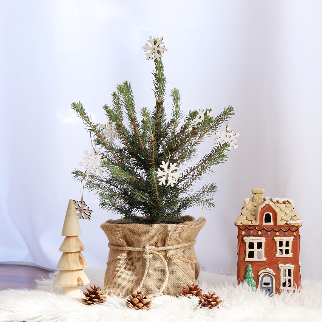 Drzewko znajduje się w doniczce produkcyjnej, osłoniętej stylową tkaniną jutową i przewiązanej dekoracyjnym jutowym sznurkiem. W zestawie znajduje się również 8 drewnianych zawieszek w kształcie płatków śniegu, które możesz od razu zawiesić na swoim drzewku, nadając mu świątecznego klimatu.