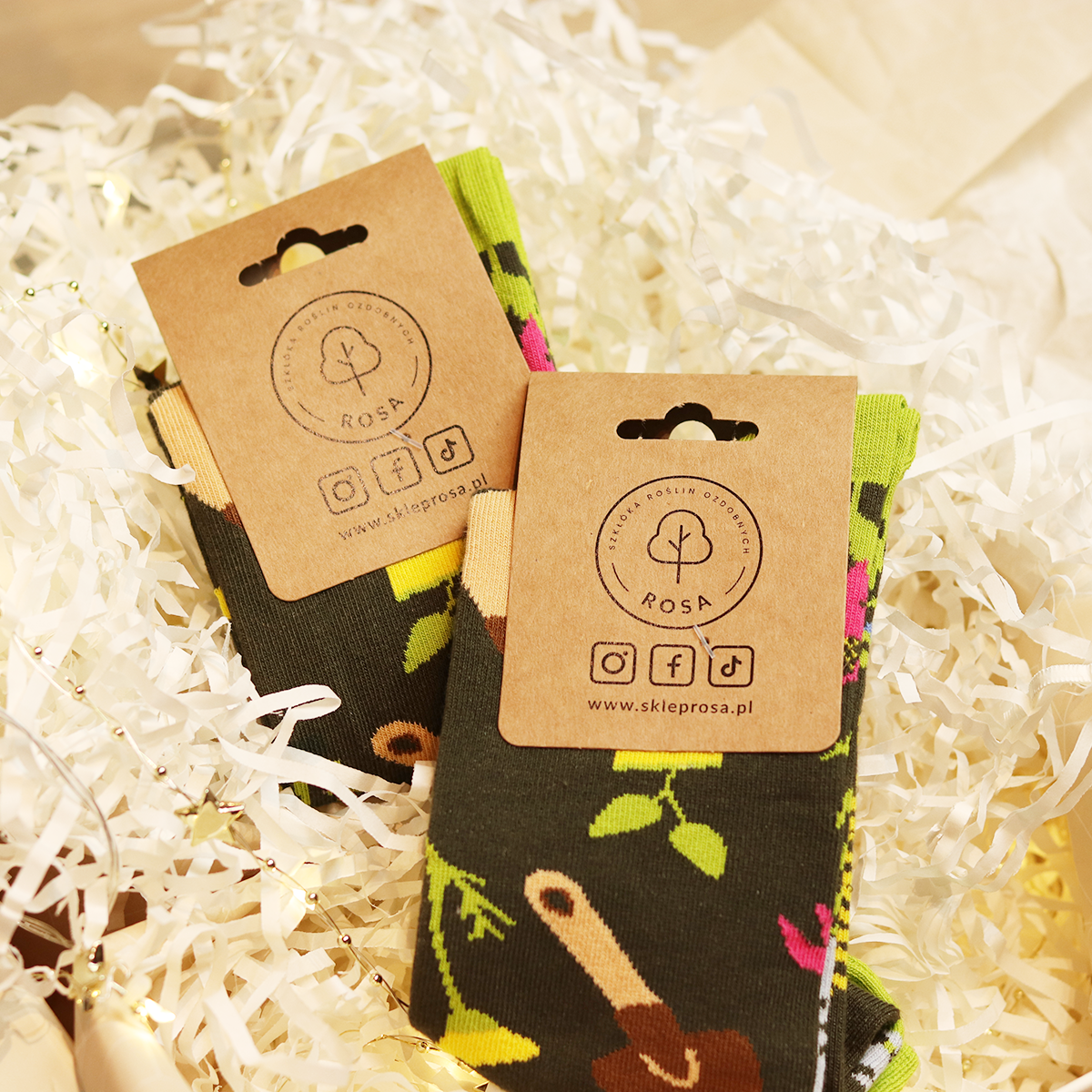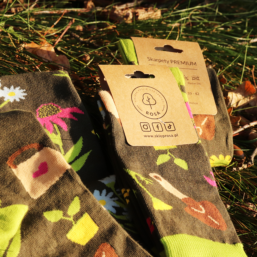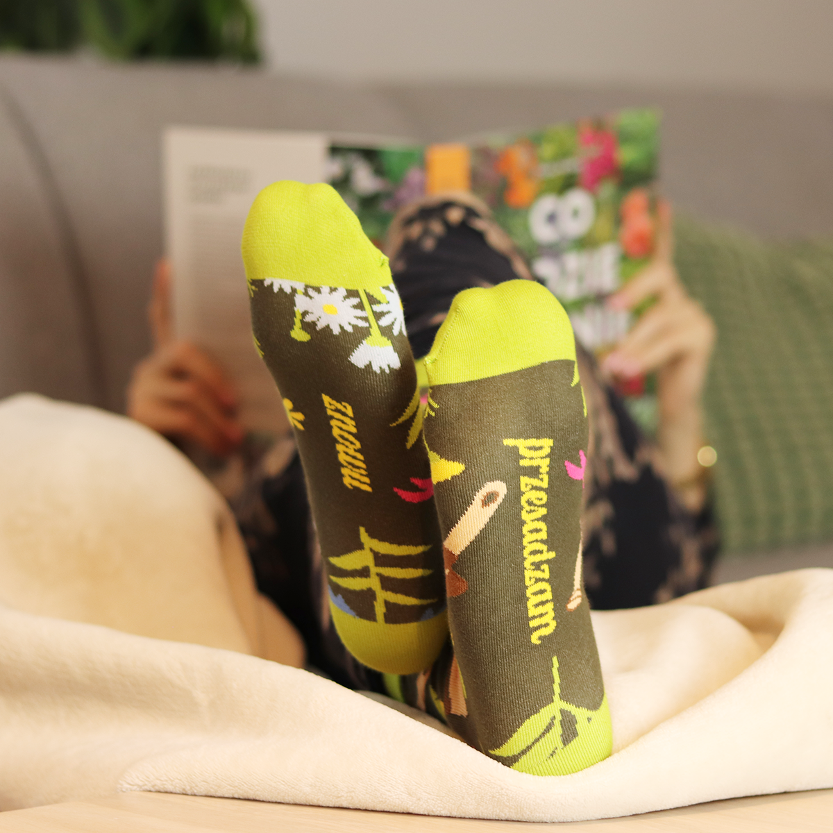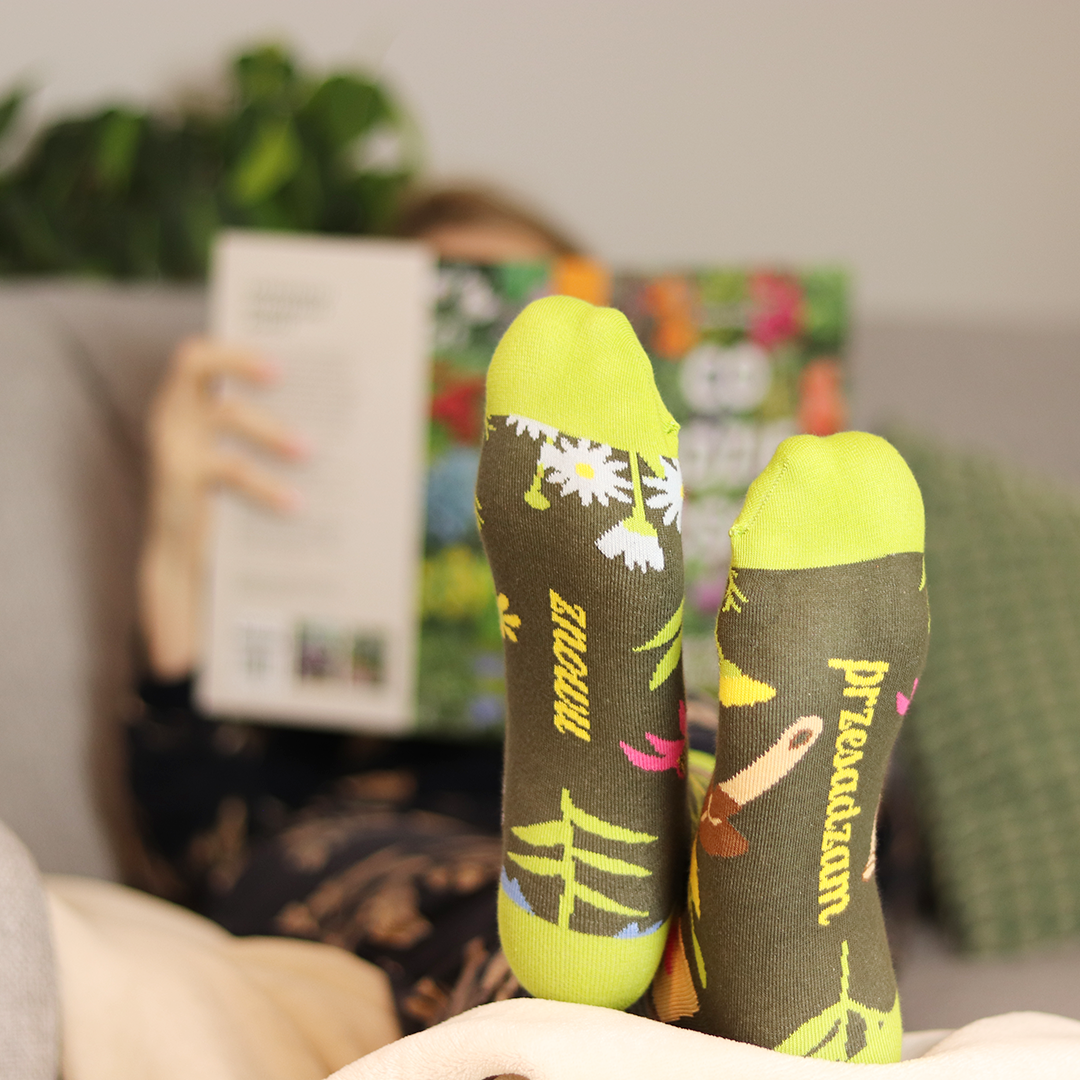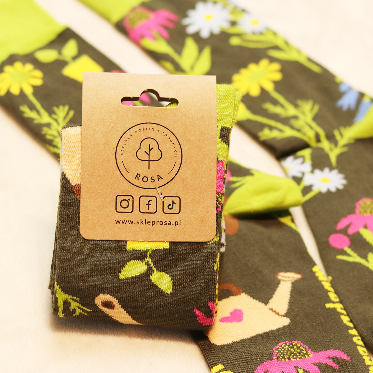 Motyw skarpetek to piękne, kwiatowe wzory z jeżówką oraz innymi żółtymi i niebieskimi kwiatami, a także ogrodniczymi detalami, jak łopatka i konewka. Całość na eleganckim ciemnozielonym tle z soczyście zielonym ściągaczem, palcami i piętą. Na spodzie umieszczono żartobliwy napis „znowu przesadzam,” który ucieszy wszystkich ogrodników i roślinoholików!