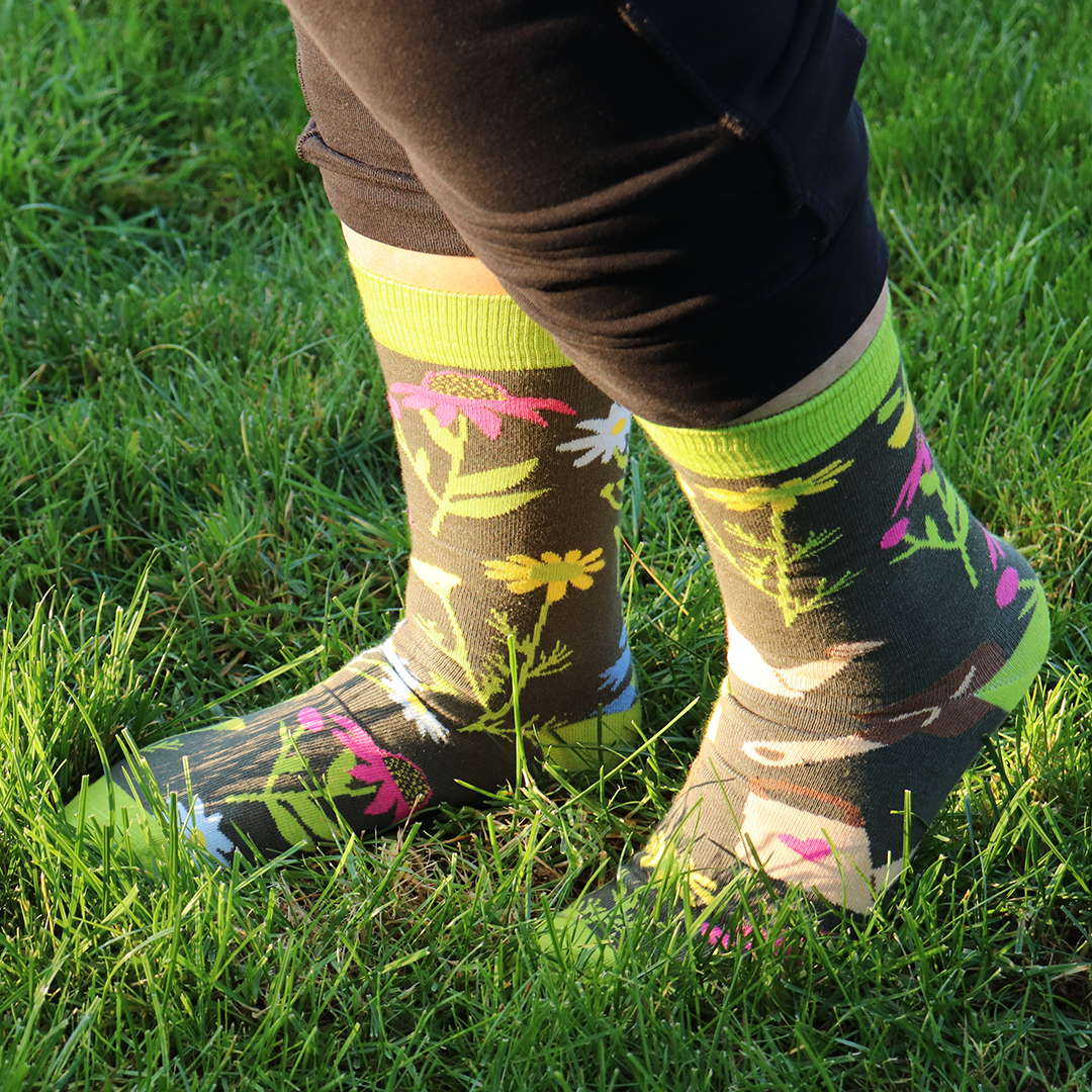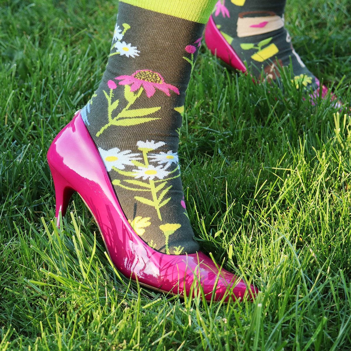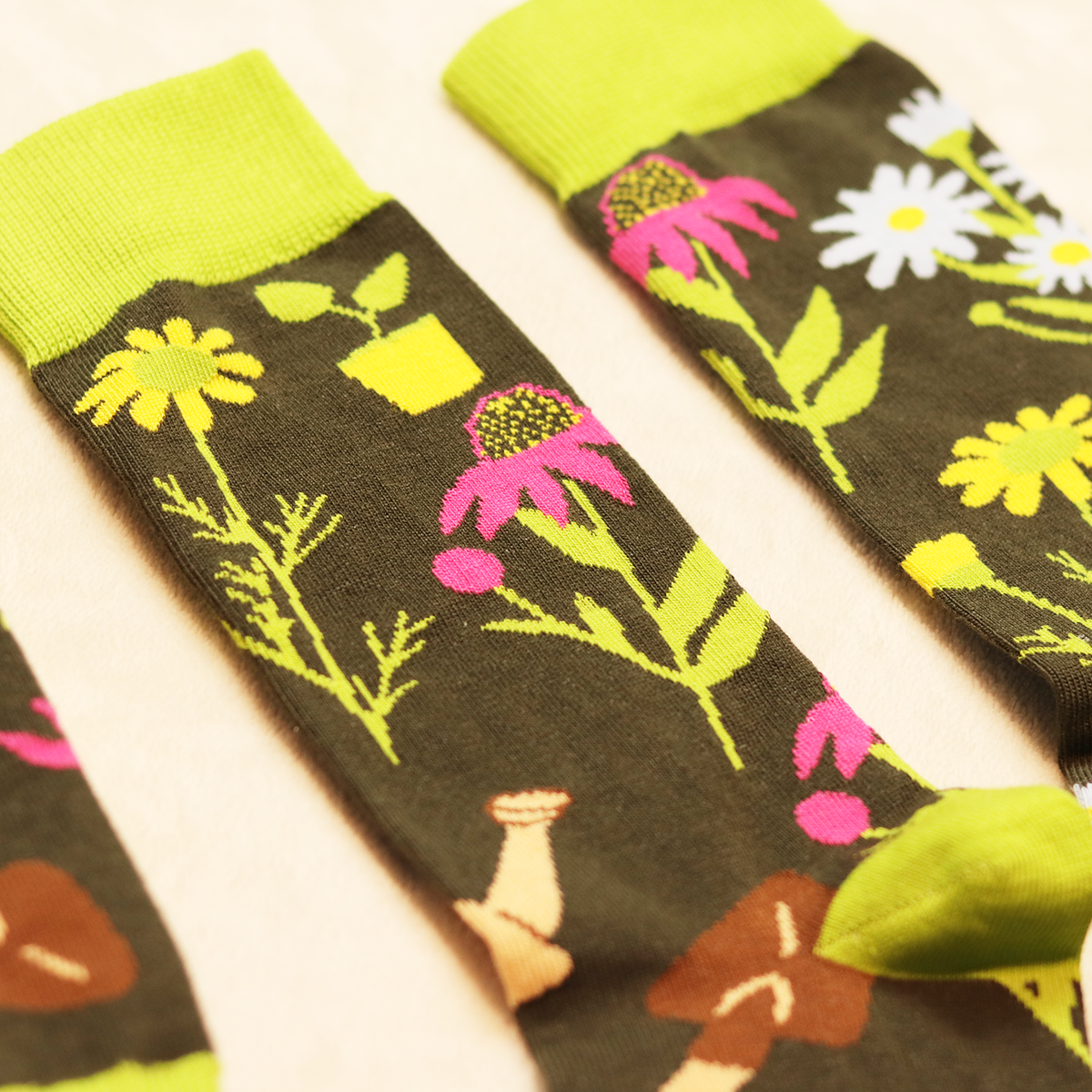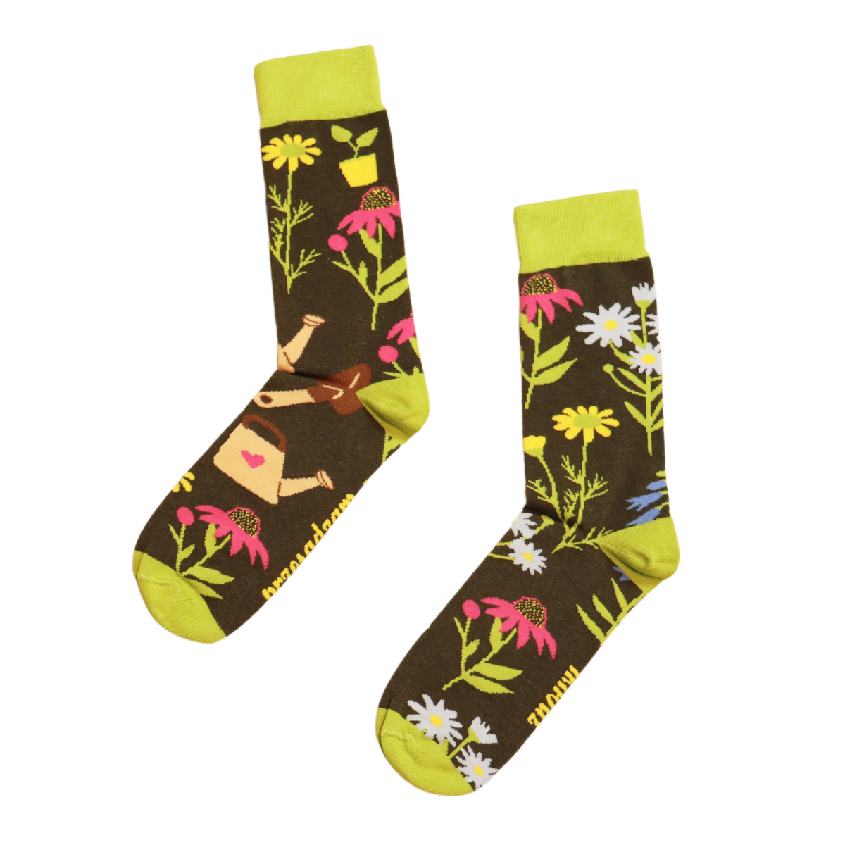Motyw skarpetek to piękne, kwiatowe wzory z jeżówką oraz innymi żółtymi i niebieskimi kwiatami, a także ogrodniczymi detalami, jak łopatka i konewka. Całość na eleganckim ciemnozielonym tle z soczyście zielonym ściągaczem, palcami i piętą. Na spodzie umieszczono żartobliwy napis „znowu przesadzam,” który ucieszy wszystkich ogrodników i roślinoholików!